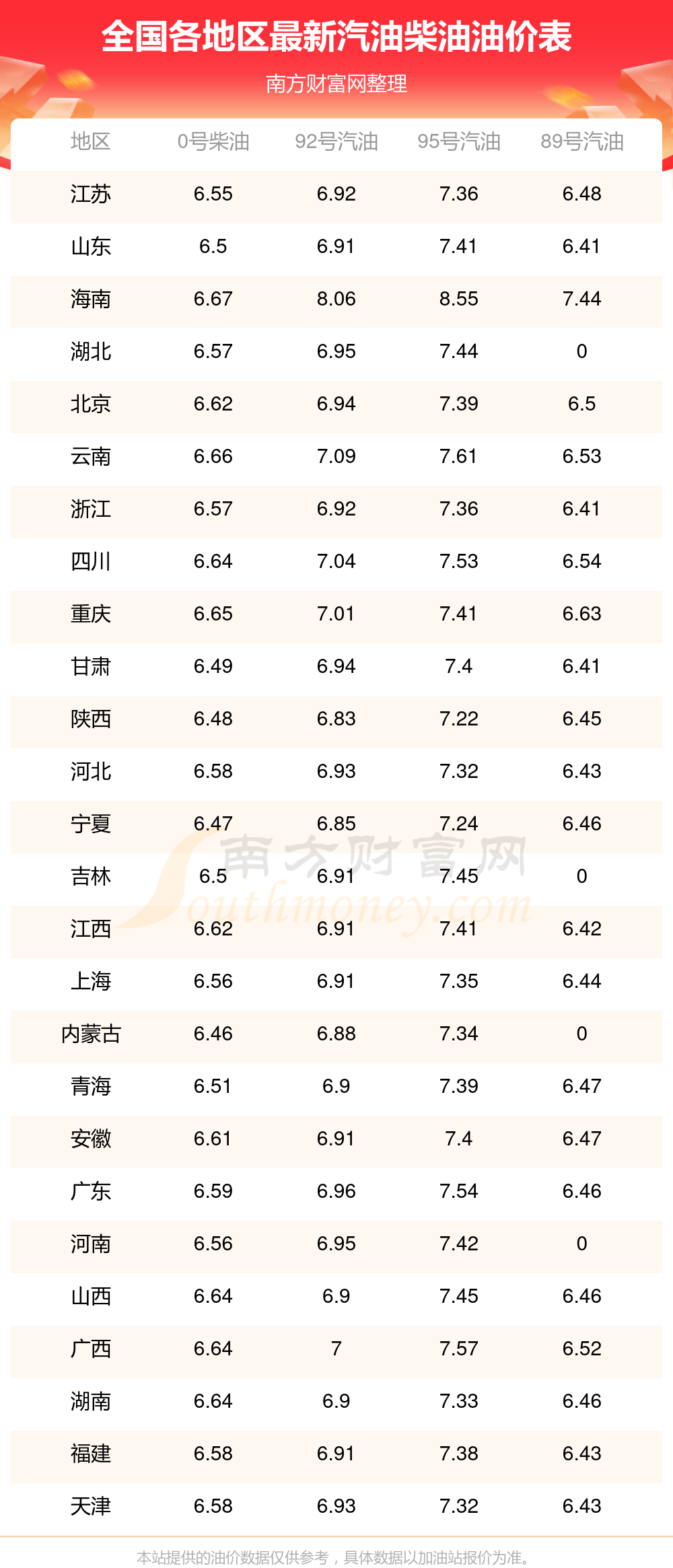 全国95号汽油11月19日的最新价格是11月11日油价调整后的价格,当中,平均价格为7元/升,最低的是陕西,价格7.22元/升,最高的是海南,价格8.55元/升。 下一轮油价调整时间11月24日24时,距离现在还有5.26天。 全国各地区2025年最新汽油价格表 2025年油价调价